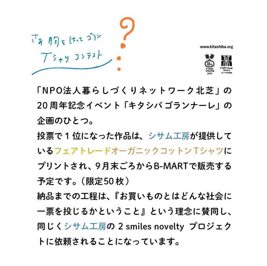 このTシャツは、NPO法人暮らしづくりネットワーク北芝の20周年記念グッズとして作成しました。